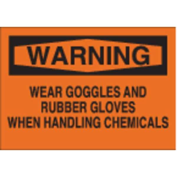 Warning Sign, Sign Subject Matter Personal Protection, Height 7 in, Width 10 in, Sign Material Polyester, Sign Mounting Style Adhesive Surface, Header Warning, Legend Wear Goggles And Rubber Gloves When Handling Chemicals, Printed Language English, Sign Shape Rectangle