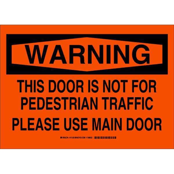 Warning Sign, Sign Subject Matter Exit and Entrance, Height 10 In., Width 14 In., Sign Material Polyester, Sign Mounting Style Adhesive Surface, Header Warning, Legend This Door Is Not For Pedestrian Traffic Please Use Main Door, Printed Language English, Sign Shape Rectangle