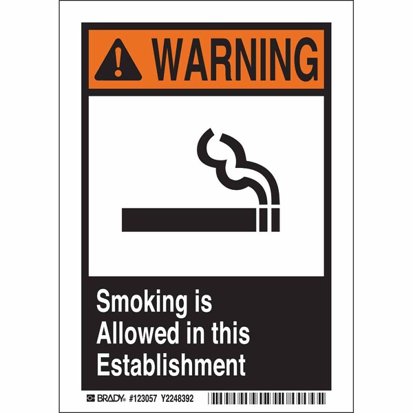 Smoking Area Sign, Sign Subject Matter No Smoking, Height 10 in, Width 7 in, Sign Material Vinyl, Sign Mounting Style Adhesive Surface, Header Warning, Legend Smoking Is Allowed In This Establishment, Printed Language English, Sign Shape Rectangle