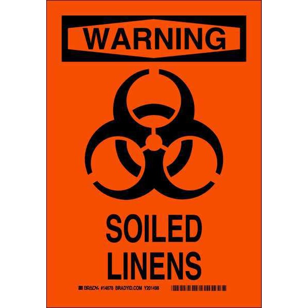 Safety Sign, Sign Subject Matter Medical and Hospital, Height 10 In., Width 7 In., Sign Material Plastic, Sign Mounting Style With Mounting Holes, Header Warning, Legend Soiled Linens, Printed Language English, Sign Shape Rectangle