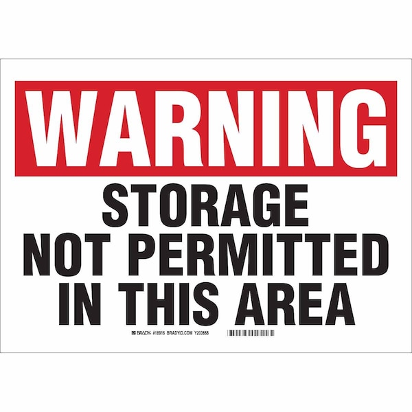 Safety Sign, Sign Subject Matter Facility, Height 10 In., Width 14 In., Sign Material Plastic, Sign Mounting Style With Mounting Holes, Header Warning, Legend Storage Not Permitted In This Area, Printed Language English, Sign Shape Rectangle