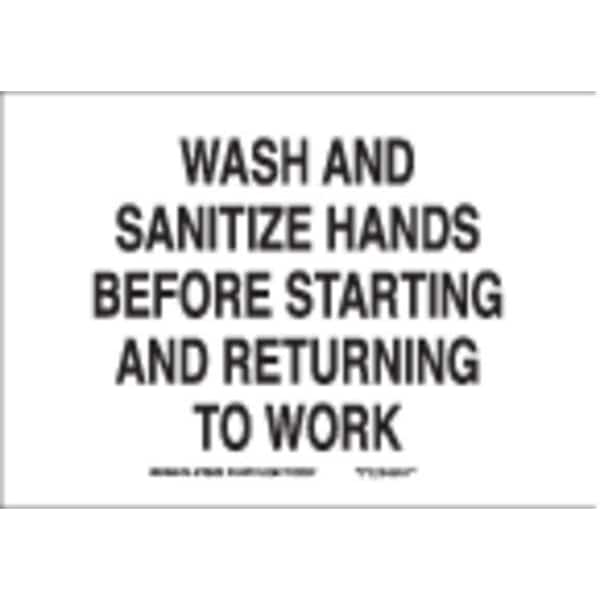 Caution Sign, Sign Subject Matter Wash Hands, Height 10 In., Width 14 In., Sign Material Plastic, Header No Header, Legend Wash And Sanitize Hands Before Starting And Returning To Work, Printed Language English, Sign Shape Rectangle