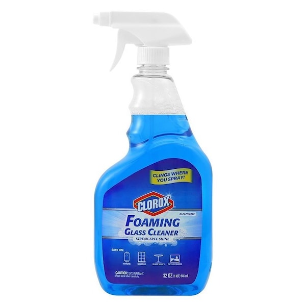 Clorox Trigger Glass Cleaner, 32 oz Net Content, Spray Bottle Container, Foam Form, Blue, Fresh Scent Odor/Scent, Compositions: Isopropyl Alcohol, Lauramine Oxide, Sodium Lauryl Ether Sulfate, Citric Acid, 2-Methyl-4-isothiazolin-3-one, >200 deg F Flash Point, >200 deg F Boiling Point, Flammability: 0, 8 to 9 pH, Spray Application Method, Applicable Materials: Windows, Tables, Mirrors