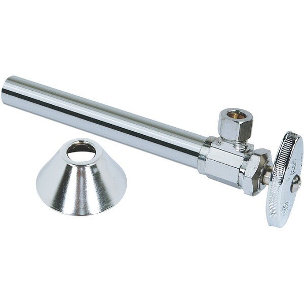 Angle valve with 5 In. sweat extension tube 1/2 In. Nominal sweat x 3/8 In. OD (outside diameter) compression with bell escutcheon. Chrome finish.