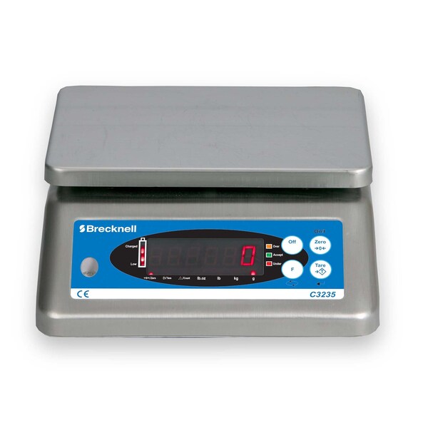 The C3235 is a waterproof NSF check weigher for the rapid indication of weight and over, under, accept tolerances in washdown environments. Available in a choice of 6 lb / 3 kg, 12 lb / 6 kg and 30 lb / 15 kg capacities with resolution of 1 part in 6000 the C3235 is ideal for portion controlling, food processing and catering kitchens applications. Simple to operate the keyboard has four buttons off, on/zero, push button tare and function. The function key gives access to the check weigher set up for targets and tolerances LED and audible alarm, unit switching and count modes. A battery charge indicator is built in to the display giving an instant check on the condition of the battery. Certifications: NSF, full FCC compliance, Prop 65, CEC, UL approved power adapter. Functions: Count, unit switching, check weigh limits with alarm, auto off after 10 minutes of inactivity. Battery Life: Approximately 20 hours charge time is 12 hours Construction: Washable and corrosion free ABS/stainless steel housing with food safe stainless steel weight platter