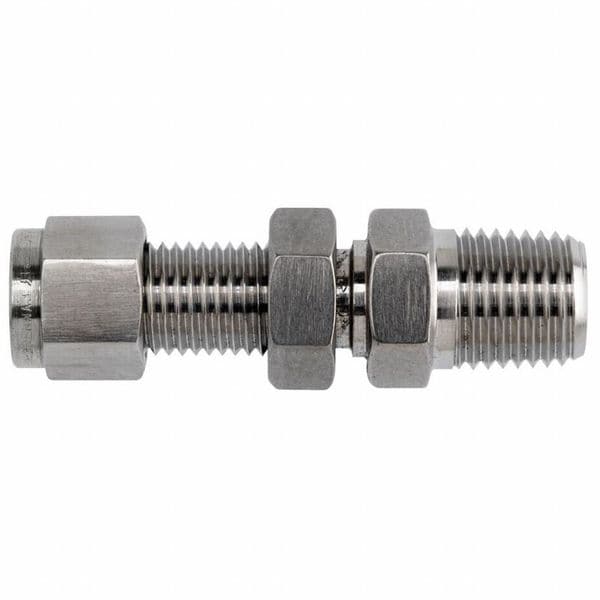 Compression Fitting Adapter, Application Hydraulics, Pneumatics, Fitting Side A Connection Type Compression, Fitting Side B Connection Type MNPT, Fitting Material Stainless Steel, Fitting Side A Tube Outer Diameter 3/4 in, Material Grade 316, Maximum Operating Pressure 2436 psi, Maximum Operating Temperature 1,200 Degrees F, Overall Length 3 in, Specific Fitting Shape Bulkhead Straight, Fitting Side A Pipe Size Not Applicable, Fitting Side B Pipe Size 3/4 in
