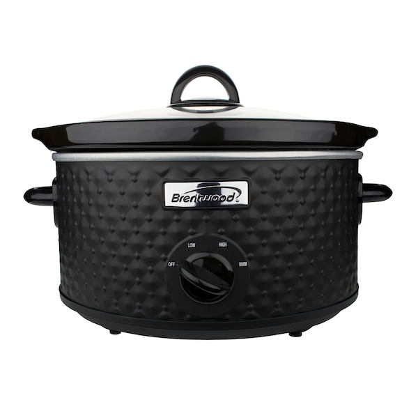 Use the 190 watt Brentwood 3.5 Quart Diamond Pattern Slow Cooker to make delicious home cooked meals while you go on with your day. Have dinner ready with little to no effort. Choose between 3 heat settings: low, high, and warm. Body is made from metal for long term durability. Cool touch handles make handling safe and simple. Our slow cooker works for your fast, on the go lifestyle. The beautiful matte black diamond pattern exterior adds a fashionable aesthetic to your kitchen. Slow cook with confidence thanks to a lead free and FDA approved ceramic inner pot.