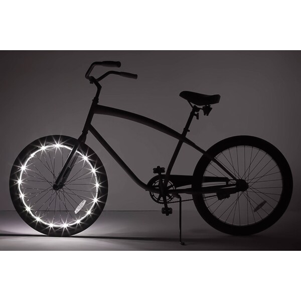 Make your wheels glow with a circle of dazzling colored light! Wheel Brightz use 7-feet of 20 micro-LED lights to light up one standard 20-29 inch wheel. Cut it to size for a clean, precise fit or spiral it within the wheel for extra fun. Each package includes one light string in weather-resistant tubing for one wheel, so you can make the world brighter your way! An attached battery pack, silicon strap, and 6 mounting ties are also included. Requires 3 AA batteries (not included) for up to 48 hours of glow, which means you can enjoy ride after ride without worrying about battery life.