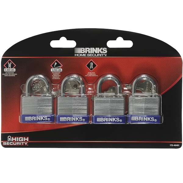 Brink’s Laminated Steel Padlock features a 40mm body and a chrome plated, hardened steel shackle for increased cut resistance. The padlock is designed with a four brass pin cylinder to increase pick and pry resistance and dual lever locking mechanism for added security. A form-fitted plastic bumper completes the look, offering protection from marring. The padlock is perfect for indoors and outdoors and is ideal to secure storage units, chains, trailers, gates, and utility boxes.