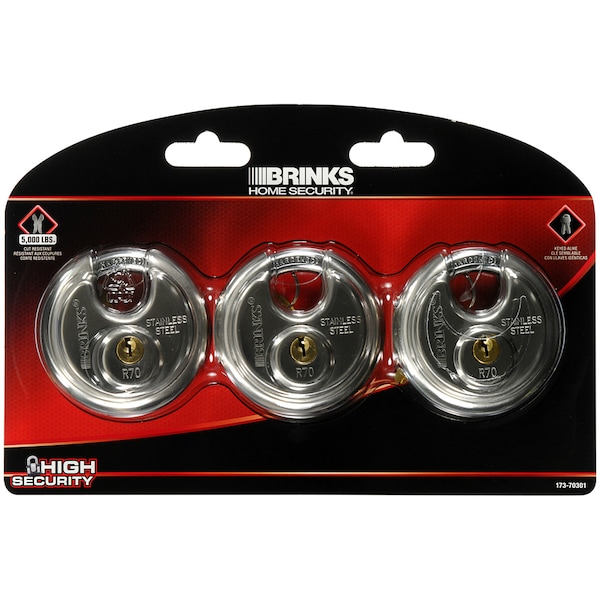 Brink’s Discus Lock features a stainless steel 70mm body and shackle for increased cut resistance. The discus padlock is equipped with a 4-pin tumbler and dual lever locking mechanism for pick and pry resistance. The shielded design minimizes shackle exposure and protects against cutting. With its corrosion and weather resistance, it is perfect for outdoor use. The padlock is ideal for securing various storage lockers, sheds, tool boxes, and doors.