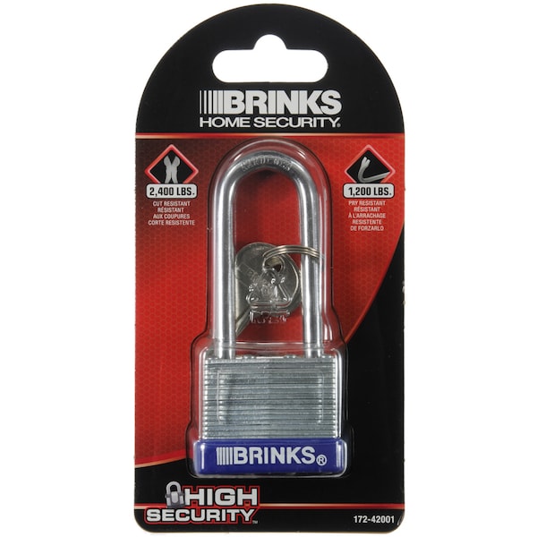 Keep your valuables safe and secured with the Brink's 40mm Long Shackle Laminated Steel Padlock. Constructed for heavy-duty security applications, the padlock features a chrome-plated, hardened steel shackle for increased cut resistance. It is equipped with a four brass pin cylinder for optimal pick and pry resistance and dual lever locking bar mechanism for maximum security. The padlock is enhanced with a 2-1/4" shackle clearance or an easier reach and flexibility. A form-fitted blue plastic bumper completes the look to safeguard and minimize scratching and marring. The laminated and hardened steel construction offers both durability and security you can depend on to keep your valuables protected. The Brink's Laminated Padlock is versatile and ideal for locking gates, chains, sheds, garages, lockers, storage containers, and toolboxes.