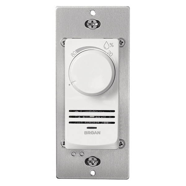 Dehumidistat,Wall Switch,Ventilation, Product Type Dehumidistat, Control Range 20 Percent, Input Voltage 120 V AC, Switch Action Close on Rise, Current Rating 9 A, Mounting Location Wall Mount, Compatible Manufacturer Part Number 440RLTK, 605RP, 744, 744L, 744LED, 744RL, AR80LWH, Includes Switch, Color White, Compatible Product Type Ventilation Fan, Standards cUL Listed, UL Listed