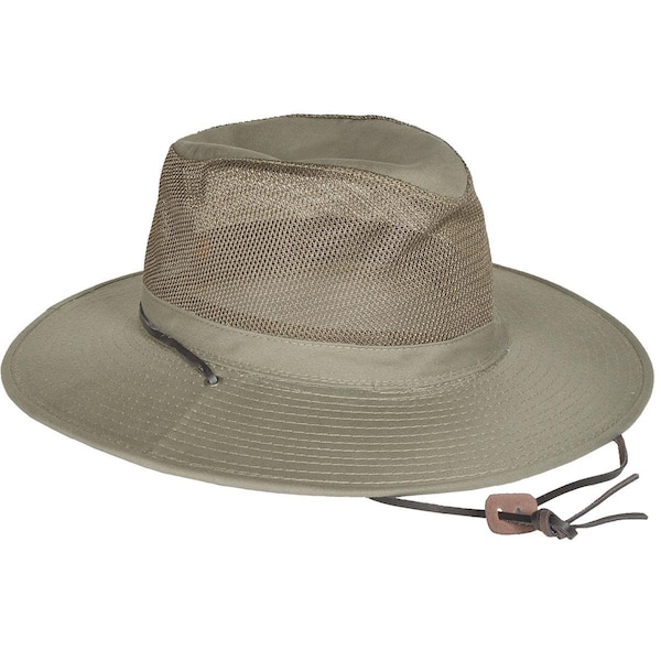 has an outback-style design that features a mesh crown to help keep your head cool on the hottest days. Brim and crown are made from treated Solarweave material that reduces 99% of the sun's harmful UVB rays. Features reinforced stitching on the 3" brim and a leather chinstrap with adjustable toggle.