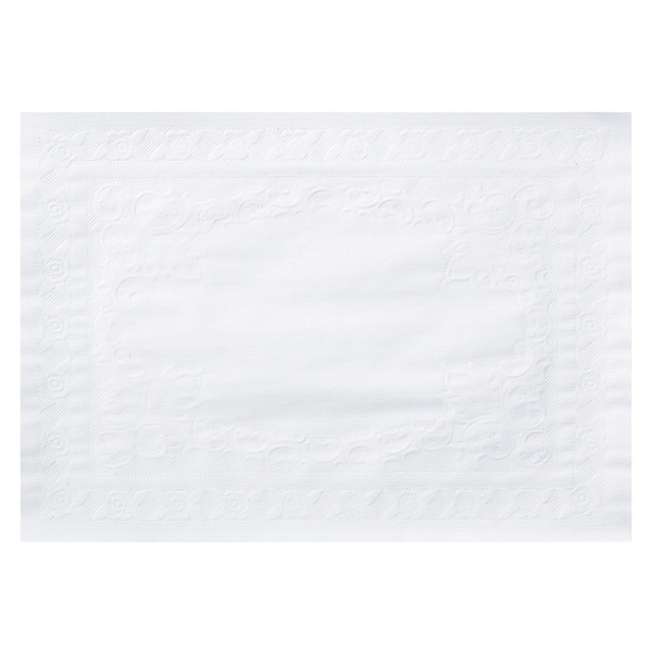 Style the tabletops at your event or business with help from these Classic Embossed White Paper Placemats. Measuring 10" x 14", these placemats feature a crisp white hue and a textured embossed floral design. Placemats will help you protect your tabletops from spills and messes while adding style and making cleanup easy. Classic Embossed White Paper Placemats are conveniently sold 1,000 per case.