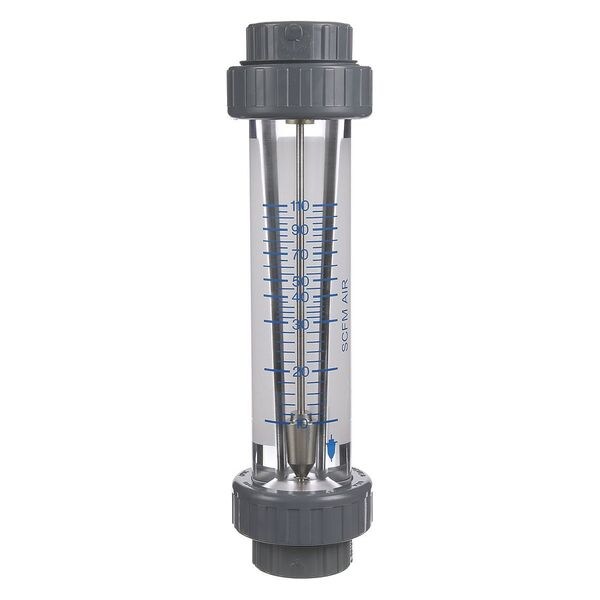 Mechanical Flowmeter, Mechanical Flowmeter, For Pipe Size 1/8 in to 1 in, Connection Size 1 1/2 in, Connection Type FNPT, Fluid Temp. Range 40 Degrees to 150 Degrees F, Wetted Materials Clear Acrylic, PVC, 316 Stainless Steel, Max. Pressure 50 psi, Flow Range 10 to 110 scfm, Max. Viscosity 79.8 SSU, Flow Material Air, Variable Area, GPM Max. -, Max. Voltage -, Length 13 3/8 in, Width 3 1/2 in, Height 3 1/2 in, Housing Material Acrylic, Fitting PVC, Chamber Material Acrylic, Seal Material -