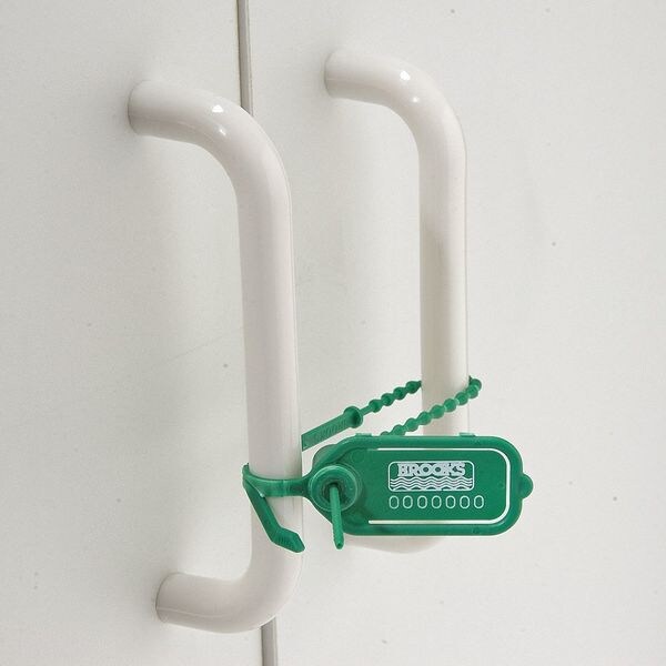 Ring Flag Bi-Directional Seal, Imprinting 2 Lines of 8 Characters Each, Number of Digits 7, Breaking Strength 12 lb., Wire Length 5-3/4 In., Thickness 7/16 In., Legend Enter, Includes Adjustable Strap, Package Quantity 100