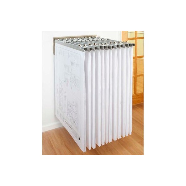 Brookside design blueprint pivot wall rack bundle w/dozen blueprint pivot hangers & dozen 42" clamps mounts directly to the wall for space saving storage. Stud spaced mounting holes permit secure fastening to the wall. Rack includes a dozen chrome plated pivot hangers that swing wide for easy access making it simple to locate and remove a file. includes a dozen 42" aluminum print clamps. Maximum capacity is 1200 sheets. Finished in a durable sand beige powder coat finish.