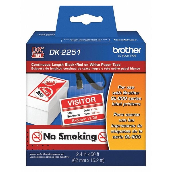 Continuous Label Roll, Adhesive Properties Permanent Adhesive, Compatible Grainger Part Number 420R56, 420R58, 420R59, Compatible Mfr Part Number QL-800, QL-810W, QL-820NWB, Label Color Black/Red on White, Label Finish Matte, Label Material Paper, Printer Series Compatibility QL-800, QL-810W, QL-820NWB, Roll Length 50 ft, Width 2 13/32 in, Indoor/Outdoor Usage Indoor, For Print Method Direct Thermal, Adhesive Adhesive, Adhesive Material Acrylic, Application General Purpose, Industrial ID