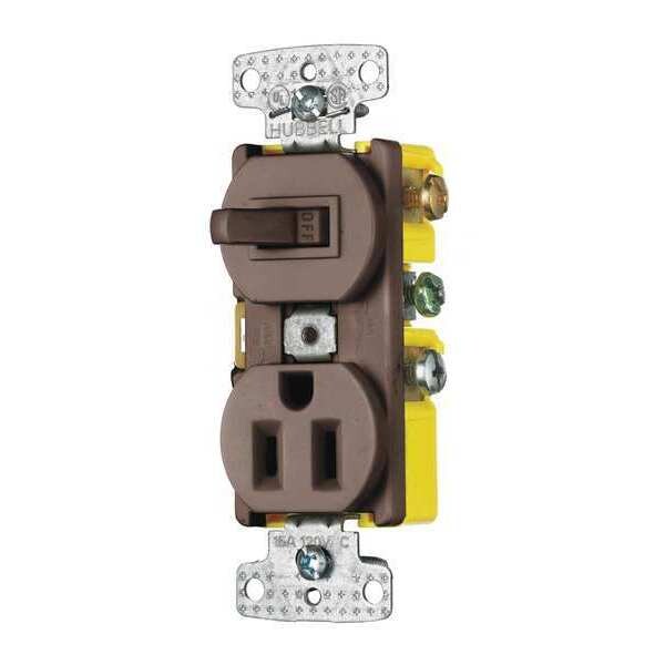 Combination Device, Current Rating 15 A, Device Type Switch and Outlet, Housing Color Brown, Mount Type Flush, NEMA Receptacle Configuration 5-15R, Number of Poles 1, Switch Style Toggle, Switch Type Single Pole, Voltage Rating 120V AC, Wiring Method Side, Grounding Grounded, Includes Mounting Hardware Yes, Mount Hole Center-to-Center Height 3.27 in, Mounting Location Wall, Number of Gangs 1, Standards UL Listed, Wire Connection Type Screw Terminals