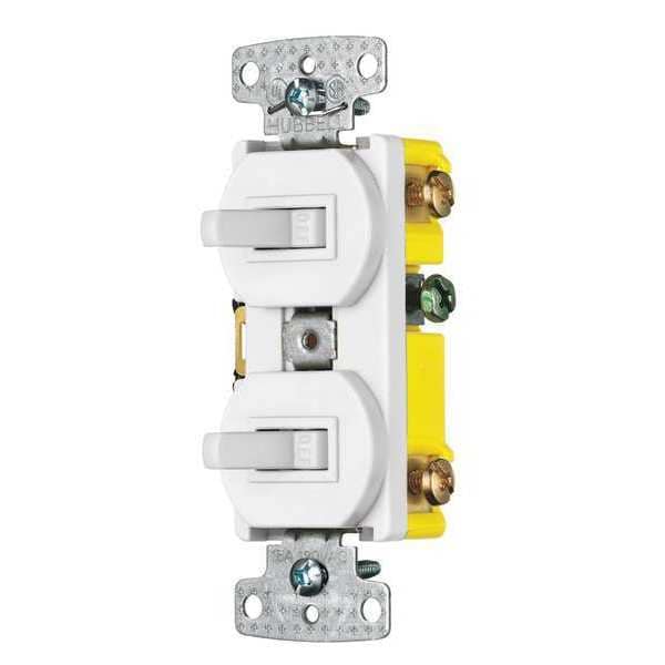Combination Device, Color White, Current Rating 15 A, Switch Function Maintained, Switch Type Single Pole/Double Throw, Voltage Rating 120V AC, Wiring Method Side, Mount Hole Center-to-Center Height 3.2 in, Number of Switches 2, Standards UL Listed, Switch Style Toggle, Wire Connection Type Screw Terminals, Features Elongated Strap with Continuous Plaster Ears, Quiet Snap Action Mechanism, Self-Grounding Staple is Standard, For Environment Dry, Grounding Grounded, Housing Material Thermoplastic