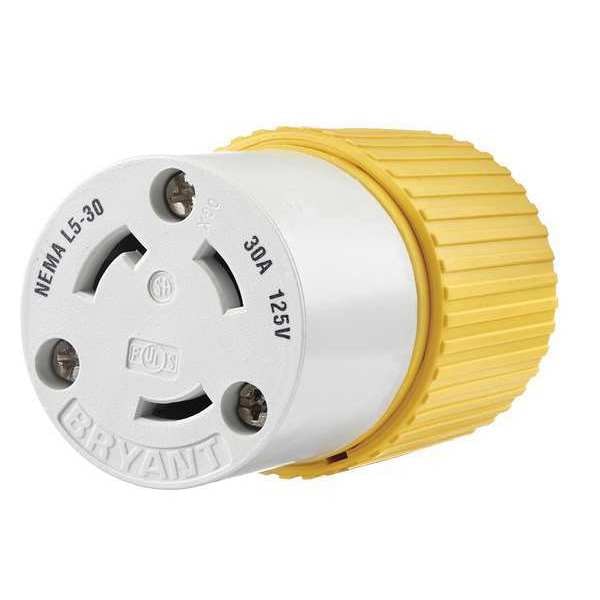 Locking Connector, Connection Orientation Straight, Current Rating 30 A, Housing Color White, Yellow, Housing Material Composite, IP Rating IP20, NEMA Receptacle Configuration L5-30R, Number of Poles 2, Number of Wires 3, Phase Single, Polarized Yes, Resistance Properties Corrosion Resistant, Shrouded No, Voltage Rating 125V AC, Wire Connection Type Screw Terminals, Wiring Style Standard, Cap Type No Cap or Cover, Grade Industrial, Grounding Grounded, Market Industrial, Midget Locking No