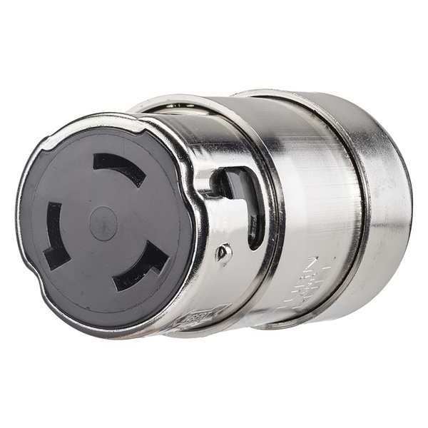 Locking Connector, Connection Orientation Straight, Current Rating 50 A, Housing Color Silver, Housing Material Brass, IP Rating IP20, NEMA Receptacle Configuration Non-NEMA, Number of Poles 3, Number of Wires 4, Phase Single, Polarized Yes, Resistance Properties Corrosion Resistant, Moisture Resistant, Shrouded No, Voltage Rating 125/250V AC, Wire Connection Type Screw Terminals, Wiring Style Standard, Cap Type Spring-Loaded Cap, For Maximum Cable Diameter 1.1 in