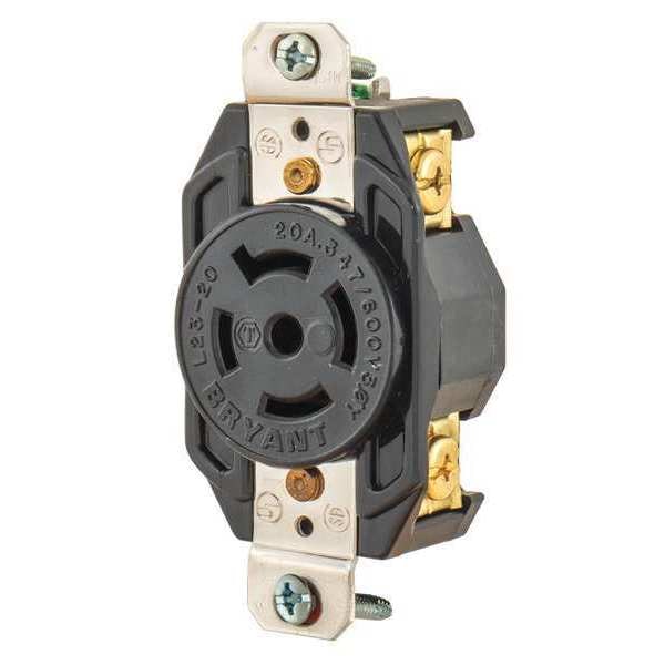 Locking Receptacle, Current Rating 20 A, Housing Color Black, Housing Material Nylon, Mount Type Flush, NEMA Receptacle Configuration L23-20R, Number of Poles 4, Number of Wires 5, Phase Three, Polarized Yes, Shrouded No, Voltage Rating 347/600V AC, Wire Connection Type Screw Terminals, Wiring Style Standard, Contact Material Copper Alloy, Grade Industrial, Grounding Grounded