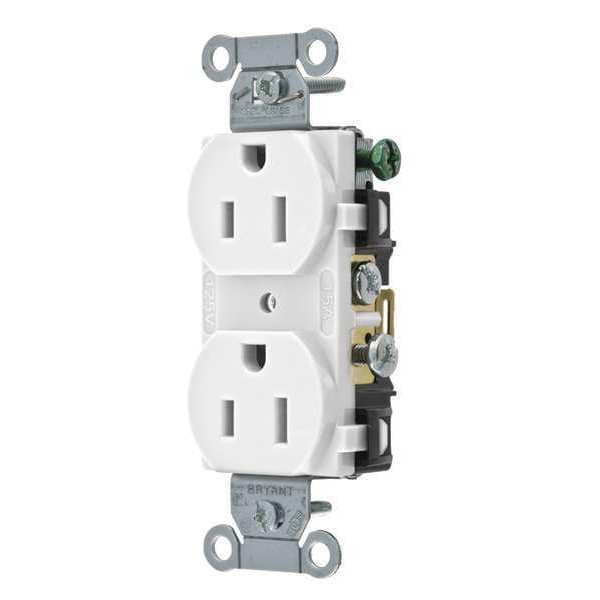 Receptacle, Connection Orientation Straight, Cover Type No Cover, Current Rating 15 A, GFCI No, Grounding Grounded, Housing Color White, Housing Material Nylon, Mount Type Flush, NEMA Receptacle Configuration 5-15R, Number of Gangs 1, Number of Poles 2, Number of Wires 3, Phase Single, Polarized Yes, Receptacle Type Duplex, Resistance Properties Corrosion Resistant, Standards CSA Certified, UL Listed, Voltage Rating 125V AC, Wire Connection Type Screw Terminals, Wiring Method Back, Side, AFCI No