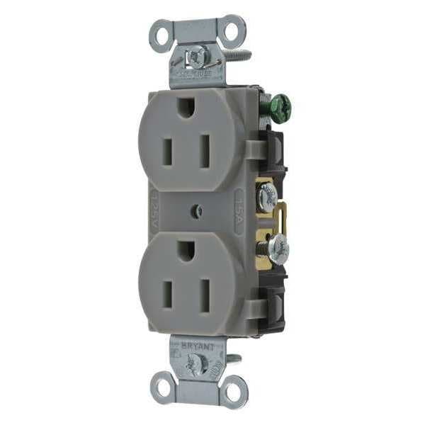 Receptacle, Connection Orientation Straight, Cover Type No Cover, Current Rating 15 A, GFCI No, Grounding Grounded, Housing Color Gray, Housing Material Composite, Mount Type Flush, NEMA Receptacle Configuration 5-15R, Number of Gangs 1, Number of Poles 2, Number of Wires 3, Phase Single, Polarized Yes, Receptacle Type Duplex, Resistance Properties Impact Resistant, Standards CSA Certified, Federal Specification, UL Listed, Voltage Rating 125V AC, Wire Connection Type Screw Terminals