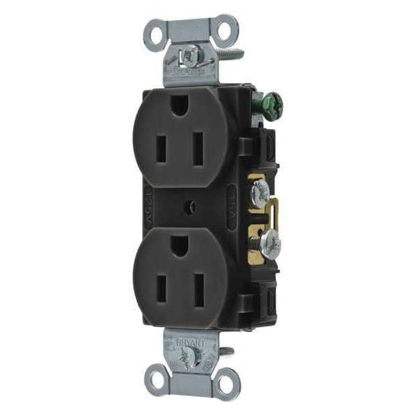 Receptacle, Connection Orientation Straight, Cover Type No Cover, Current Rating 15 A, GFCI No, Grounding Grounded, Housing Color Black, Housing Material Composite, Mount Type Flush, NEMA Receptacle Configuration 5-15R, Number of Gangs 1, Number of Poles 2, Number of Wires 3, Phase Single, Polarized Yes, Receptacle Type Duplex, Resistance Properties Impact Resistant, Standards CSA Certified, Federal Specification, UL Listed, Voltage Rating 125V AC, Wire Connection Type Screw Terminals