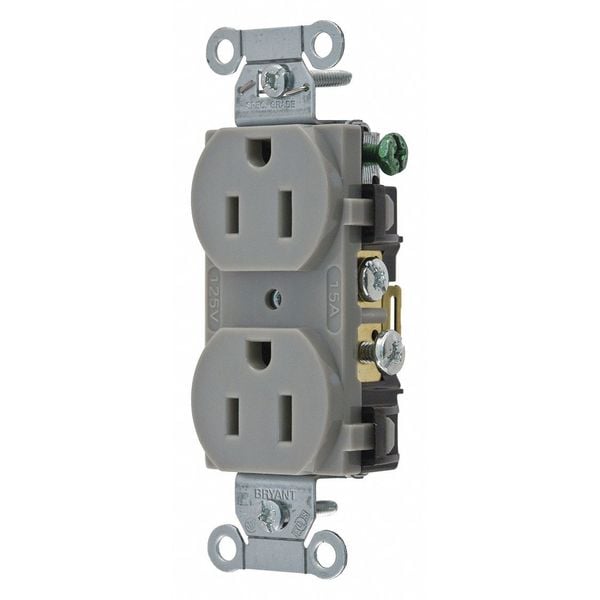 Receptacle, Connection Orientation Straight, Cover Type No Cover, Current Rating 15 A, GFCI No, Grounding Grounded, Housing Color Gray, Housing Material Composite, Mount Type Flush, NEMA Receptacle Configuration 5-15R, Number of Gangs 1, Number of Poles 2, Number of Wires 3, Phase Single, Polarized Yes, Receptacle Type Duplex, Resistance Properties Impact Resistant, Standards CSA Certified, Federal Specification, UL Listed, Voltage Rating 125V AC, Wire Connection Type Screw Terminals