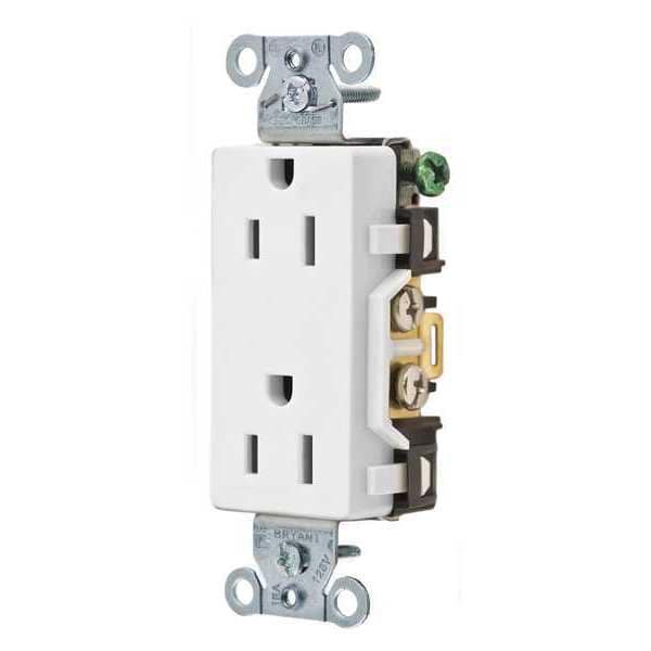Receptacle, Connection Orientation Straight, Cover Type No Cover, Current Rating 15 A, GFCI No, Grounding Grounded, Housing Color White, Housing Material Composite, Mount Type Flush, NEMA Receptacle Configuration 5-15R, Number of Gangs 1, Number of Poles 2, Number of Wires 3, Phase Single, Polarized Yes, Receptacle Type Decorator Duplex, Resistance Properties Impact Resistant, Standards CSA Certified, Federal Specification, UL Listed, Voltage Rating 125V AC, Wire Connection Type Screw Terminals