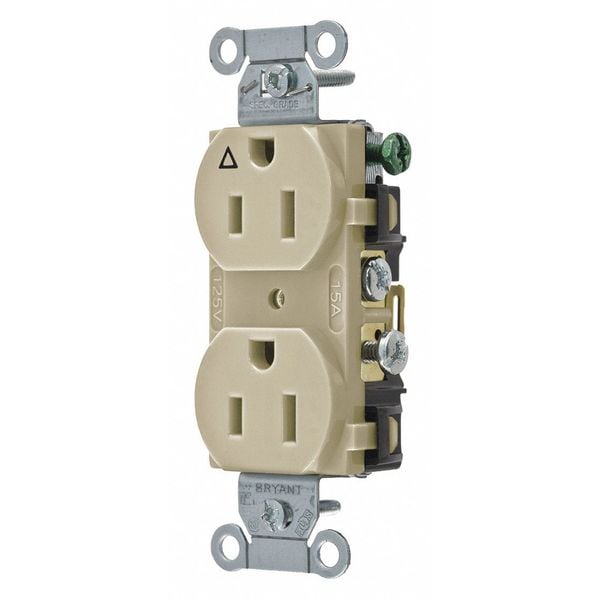 Receptacle, Connection Orientation Straight, Cover Type No Cover, Current Rating 15 A, GFCI No, Grounding Grounded, Isolated Ground, Hazardous Location Specification Not Applicable, Housing Color Ivory, Housing Material Composite, Mount Type Flush, NEMA Enclosure Rating Not Applicable, NEMA Receptacle Configuration 5-15R, Number of Gangs 1, Number of Poles 2, Number of Wires 3, Phase Single, Polarized Yes, Receptacle Type Duplex, Resistance Properties Corrosion Resistant