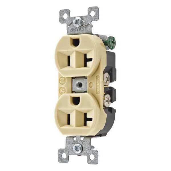 Receptacle, Connection Orientation Straight, Cover Type No Cover, Current Rating 20 A, GFCI No, Grounding Grounded, Housing Color Ivory, Housing Material Composite, Thermoplastic, Mount Type Flush, NEMA Receptacle Configuration 5-20R, Number of Gangs 1, Number of Poles 2, Number of Wires 3, Phase Single, Polarized Yes, Receptacle Type Duplex, Resistance Properties Impact Resistant, Standards CSA Certified C22.2, Federal Specification W-C-596, NEMA WD-6, UL E2186, Voltage Rating 125V AC
