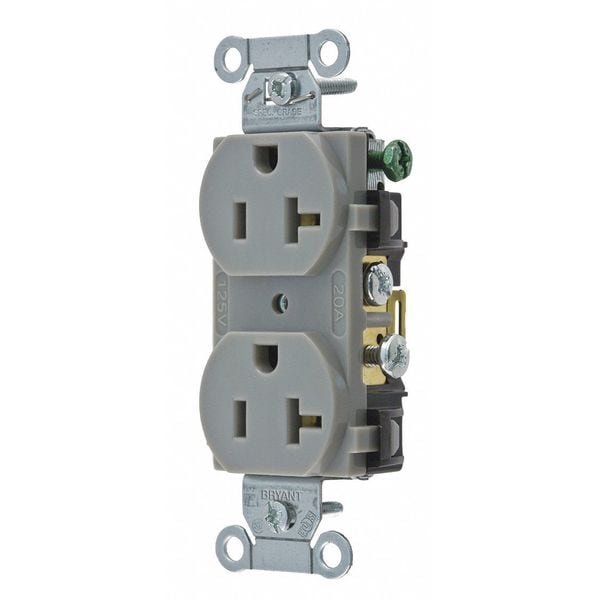 Receptacle, Connection Orientation Straight, Cover Type No Cover, Current Rating 20 A, GFCI No, Grounding Grounded, Housing Color Gray, Housing Material Composite, Mount Type Flush, NEMA Receptacle Configuration 5-20R, Number of Gangs 1, Number of Poles 2, Number of Wires 3, Phase Single, Polarized Yes, Receptacle Type Duplex, Resistance Properties Impact Resistant, Standards CSA Certified, Federal Specification, UL Listed, Voltage Rating 125V AC, Wire Connection Type Screw Terminals