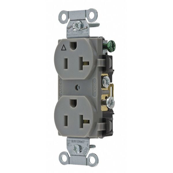 Receptacle, Connection Orientation Straight, Cover Type No Cover, Current Rating 15 A, GFCI No, Grounding Grounded, Isolated Ground, Housing Color Gray, Housing Material Composite, Mount Type Flush, NEMA Receptacle Configuration 5-20R, Number of Gangs 1, Number of Poles 2, Number of Wires 3, Phase Single, Polarized Yes, Receptacle Type Duplex, Standards CSA Certified, Federal Specification, UL Listed, Voltage Rating 125V AC, Wire Connection Type Screw Terminals, Wiring Method Back, Side, AFCI No