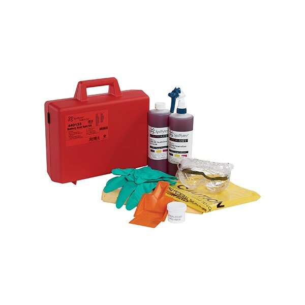 Place in strategic locations for quick response to leaking or spilled battery acid. Also effective for clean-up of dry cell batteries; Stores in red plastic case; Kit includes: 2 Quarts Kolor-Safe Liquid Acid Neutralizer, 10 12 x 12'' Hazmat Pads, 1 oz. Aqualockit Polymer, 1 pr. Nitrile Gloves, 1 pr. Splash Goggles, 1 Poly Apron, 1 Trigger Sprayer, 1 Scoop w/Detachable Scraper. This product is equivalent to part number: S-19486.