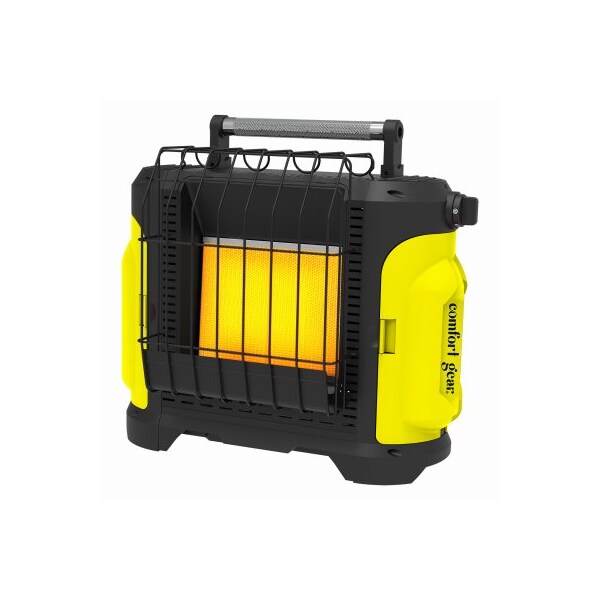 COMFORT GEAR 10000 Btu Portable Propane Heater. Operates on 1 lb. LP tank. Larger plaque provides higher heat output. Large rugged carrying handle. Convenient swivel valve provides easy tank loading. Push button ignition. Safety features include built-in oxygen depletion sensor ODS accidental tip-over shut off and protective grill guard. No electricity required. Indoor safe. When outdoors heater can also be hooked up to 20 lb. Heats up to 250 sq. ft. CSA Certified.