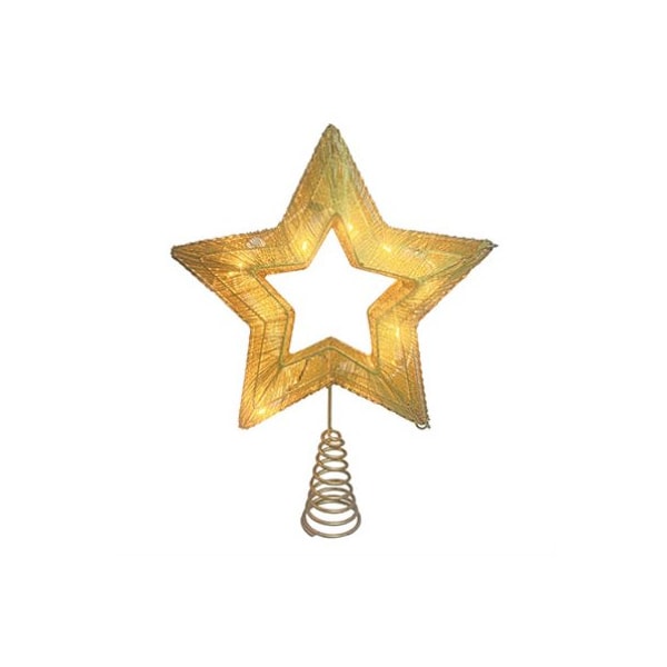 SYLVANIA 10 Lt 11 Gold Star Wire String Tree Top with Spring Stand. Size:10*2.75*11H 10 clear mini bulbs 30 lead cord green wire indoor only. Color box with window. UL Listed