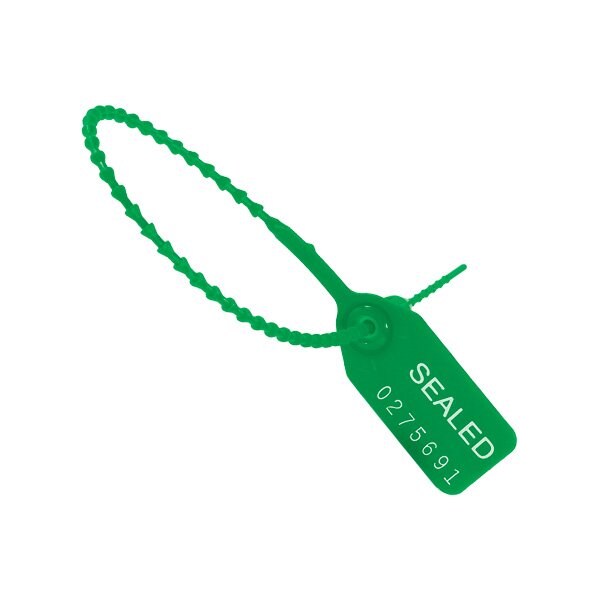 One time use tamper evident pull-tight adjustable security seals. Allows the user to cinch-up the seal according to their specific size requirements. A heavy-duty, adjustable security seal designed for use on transportation and storage equipment or anywhere a multi-locking, tamper evident pull-tight security device is needed. Ideal for situations requiring varying seal lengths; Heavy-duty, all plastic, one-piece construction; Tamper-resistant acetal locking mechanism; Weather resistant; withstands extremes of cold and heat; Consecutively numbered; Matted in strips of 10 for ease-of-use. This product is equivalent to part number: H-610G. Sold in a quantity of 100 per case.