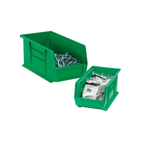 Keep small parts organized. Durable plastic construction; Flat front panel is perfect for labeling; Bins stack to save space; Maximize the efficiency of bins by using Bin Divider stock number BIND148; May be used with Bin Organizers; Sold by the individual bin in case quantities; Inside Dimensions: 15 1/8 x 10 x 7 3/4''; Fits shelf size 16''; Optional Label Holders available. Sold in a quantity of 4 per case.