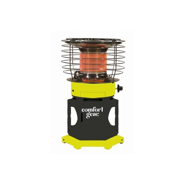 Comfort Gear 13500-18000 BTU Portable 360 Degree Double Tank Propane LP Heater Yellow/Black Piezo Ignition Heats In A 360 Degree Radius Built In Oxygen Depletion Sensor Safety Tip Over Shut Off Protective Grill Guard Single 1 Button Lighting/Heat Control Swivel Valve For Easy Loading Utilizes 2 Disposable 1 LB Propane Bottles Built In Carry Handle For Easy Mobility 450 SQFT Outdoor & Indoor Options.