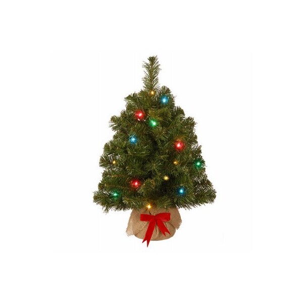 2 ft. Noble Fir Artificial Tree. Features 15 multi battery operated LED lights and timer. Has 71 tips and a 16 diameter. Burlap base with red bow.