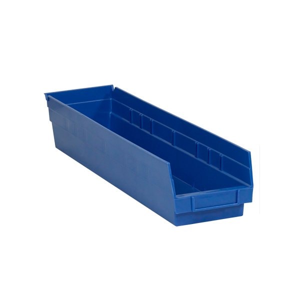 Organize your inventory with sturdy plastic bins. Nestable bins are manufactured from FDA compliant polypropylene resins; Slotted label holder allows for easy insertion of label or identification card; Built-in rear hanglock allows for bins to tilt out for complete access to contents when on shelving; Bins are long-lasting, reusable, waterproof and unaffected by grease, oil and most chemicals; Maximize the efficiency of bins by using Bin Divider stock number BINDS23 or Bin Cups; Sold by the individual bin in case quantities; Inside Dimensions: 22 1/8 x 3 x 4''. This product is equivalent to part number: S-14625BLU. Sold in a quantity of 16 per case.