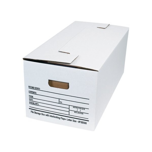 Top flaps interlock to make files easily accessible yet keep contents clean and secure. This storage box is recommended for letter size files; No tape or glue needed. One piece cartons folds together in seconds; Double layered bottom provides extra strength; Manufactured from 200#/ECT-32 corrugated; Cartons feature a write on area on two sides for labeling with content information; Sold in cases of 12. Sold in a quantity of 12 per case.