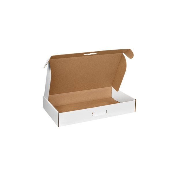 Use these easy-to-carry cases when you are on the go. Great for transporting products, promotional materials, samples or literature; One-piece die cut design folds together in seconds without tape or glue; Manufactured from strong 200#/ECT-32-B, white corrugated; Plastic handles insert into folded case and are included with each bundle. This product is equivalent to part number: S-13486. Sold in a quantity of 10 per pack.