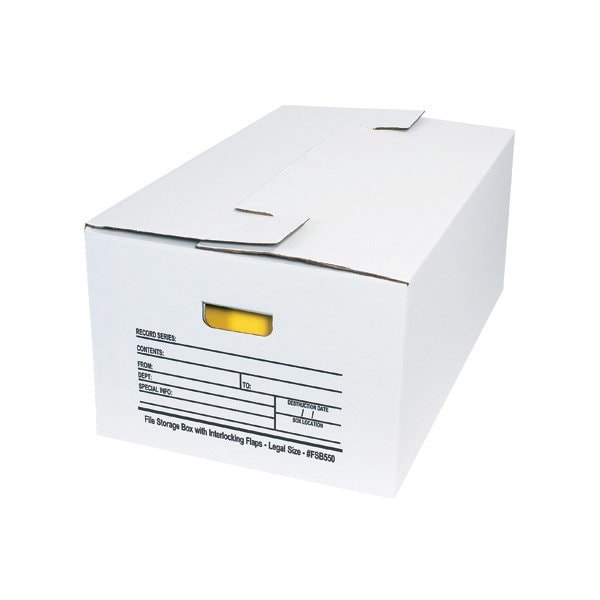 Top flaps interlock to make files easily accessible yet keep contents clean and secure. This storage box is recommended for legal size files; No tape or glue needed. One piece cartons folds together in seconds; Double layered bottom provides extra strength; Manufactured from 200#/ECT-32 corrugated; Cartons feature a write on area on two sides for labeling with content information; Sold in cases of 12. Sold in a quantity of 12 per case.