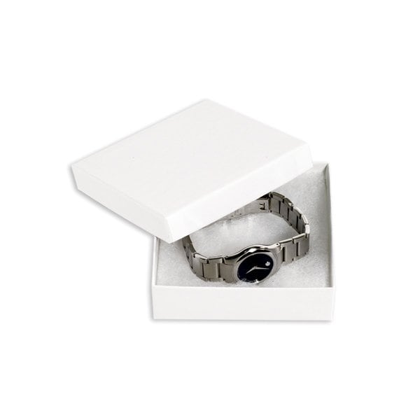 Great for jewelry and other small items. High quality two-piece construction; Fully assembled to save time; Each box is filled with non tarnishing jeweler's cotton; Constructed from rigid white lined fibreboard; Recommended uses: Broach, Bracelet. This product is equivalent to part number: S-9811. Sold in a quantity of 100 per case.