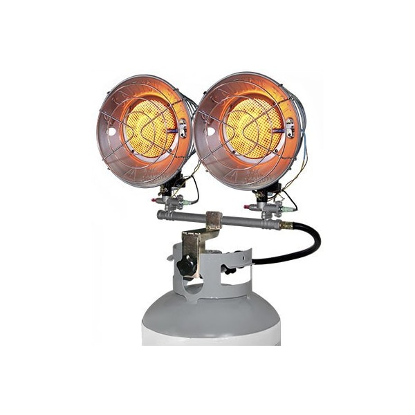 30000 BTU Tank Top Propane Heater Variable Control For 18000 - 26000 - 30000 BTUs Double Burner Heads Swivel Independently To Allow Multi-Directional Heating Operates Up To 24 Hours Attached To A Standard 20 LB Propane Cylinder For Almost Any Outdoor Activity. No Electricity Required CSA Certified.