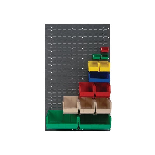 Maximize storage capacity in a small amount of space. Customize your unit by choosing the bin sizes of your choice; Wall Mounted Panel Rack saves floor and workbench space; 500 pound capacity; Stack & Hang Bins sold separately.